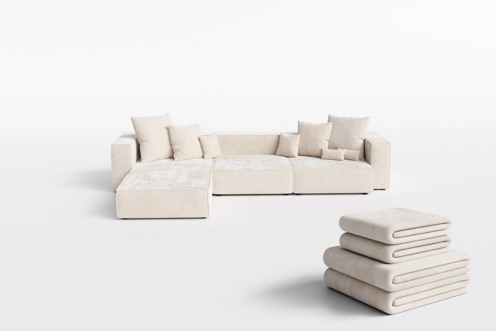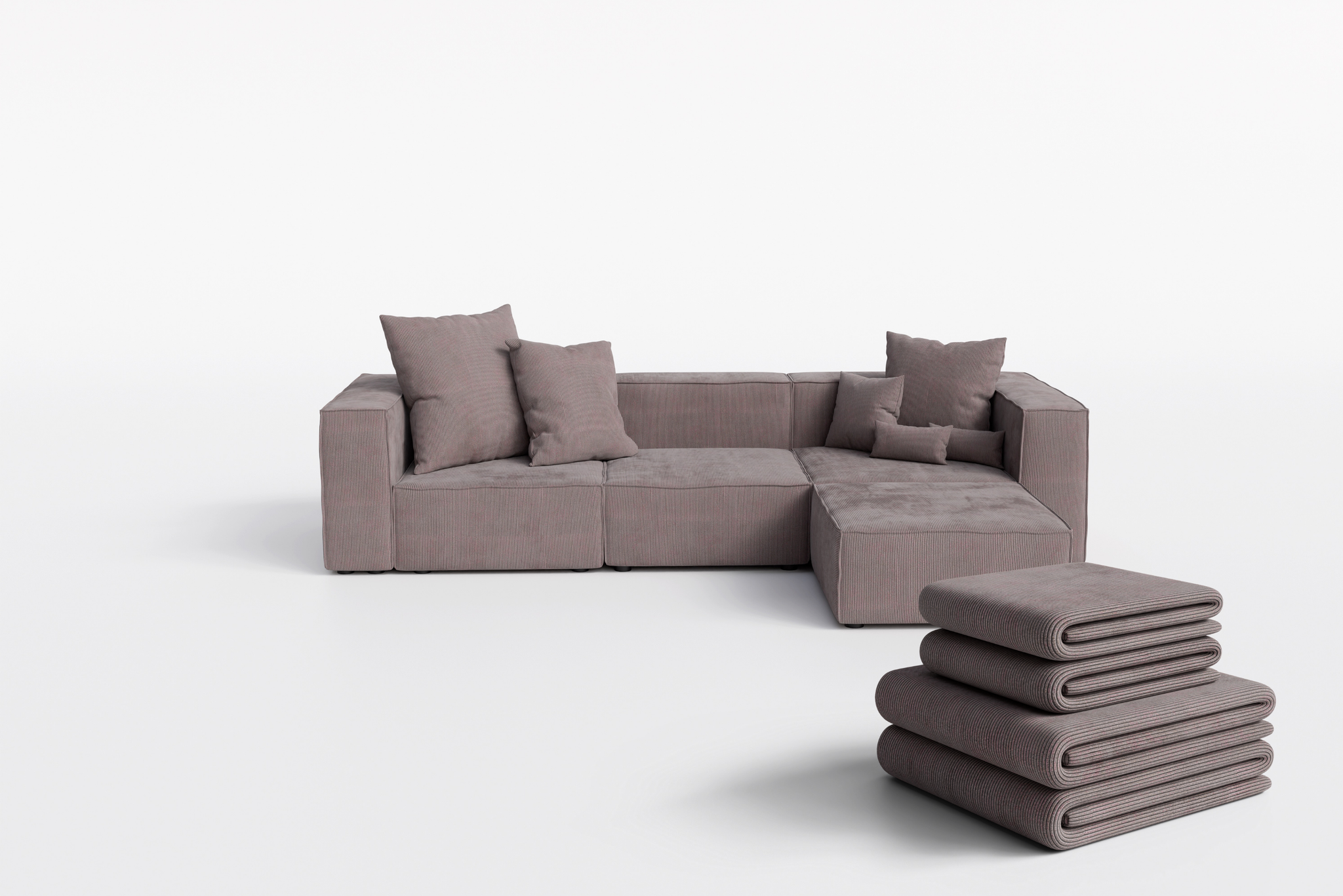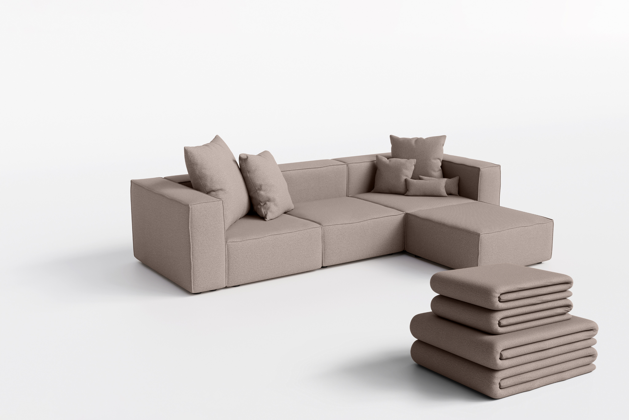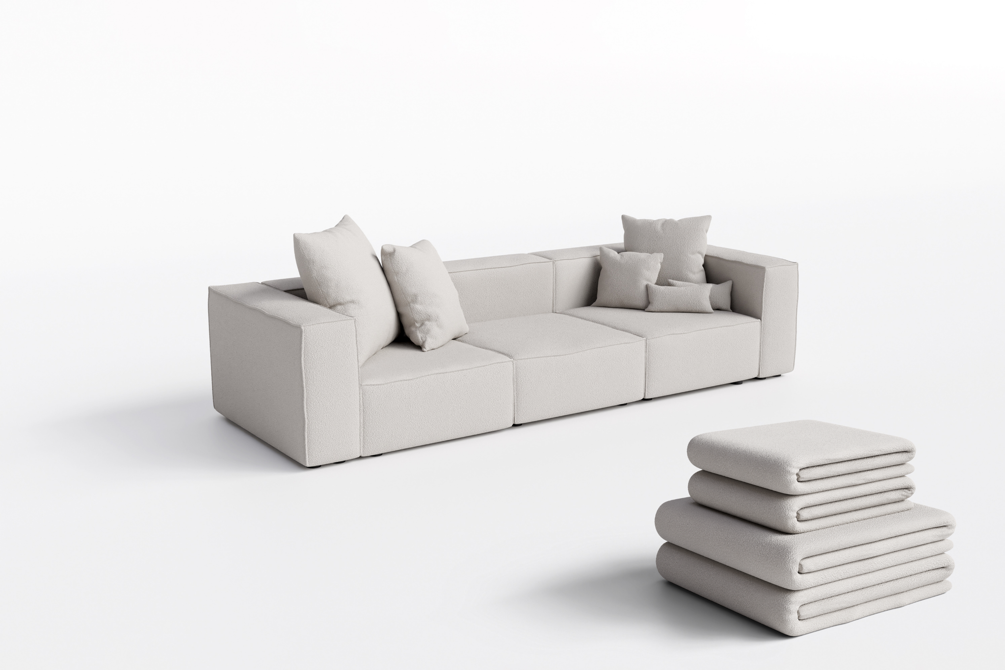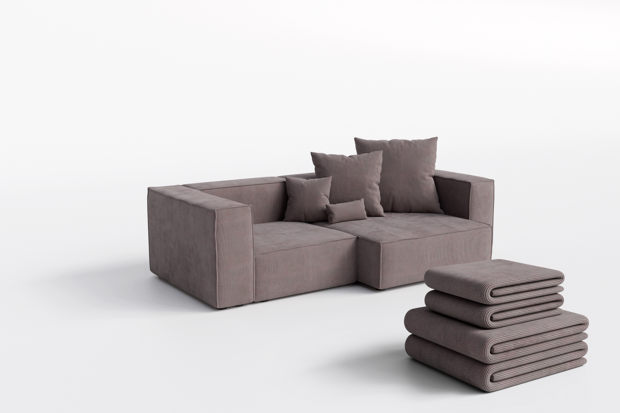 - Das gewählte Sofa als einzelne Module – bereits mit dem gewählten Stoff bezogen
