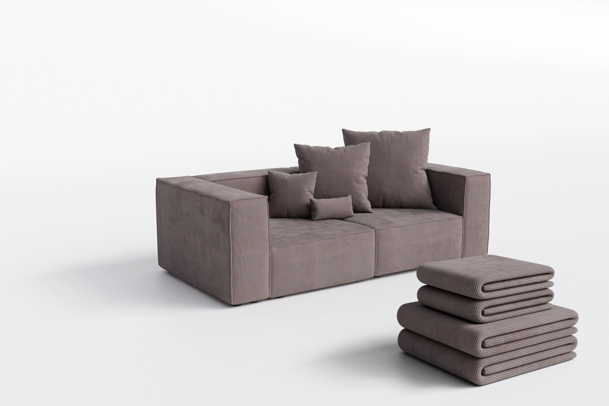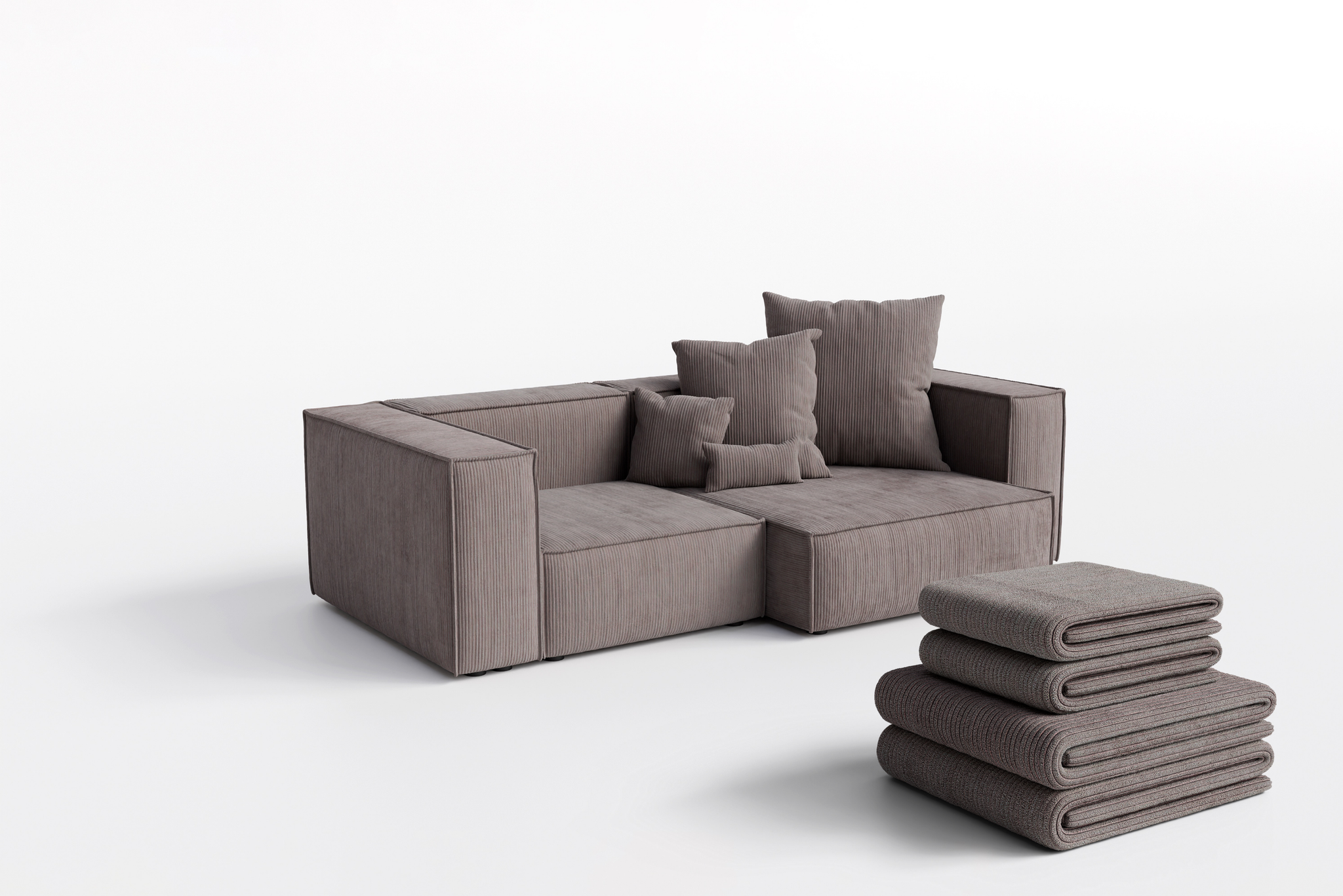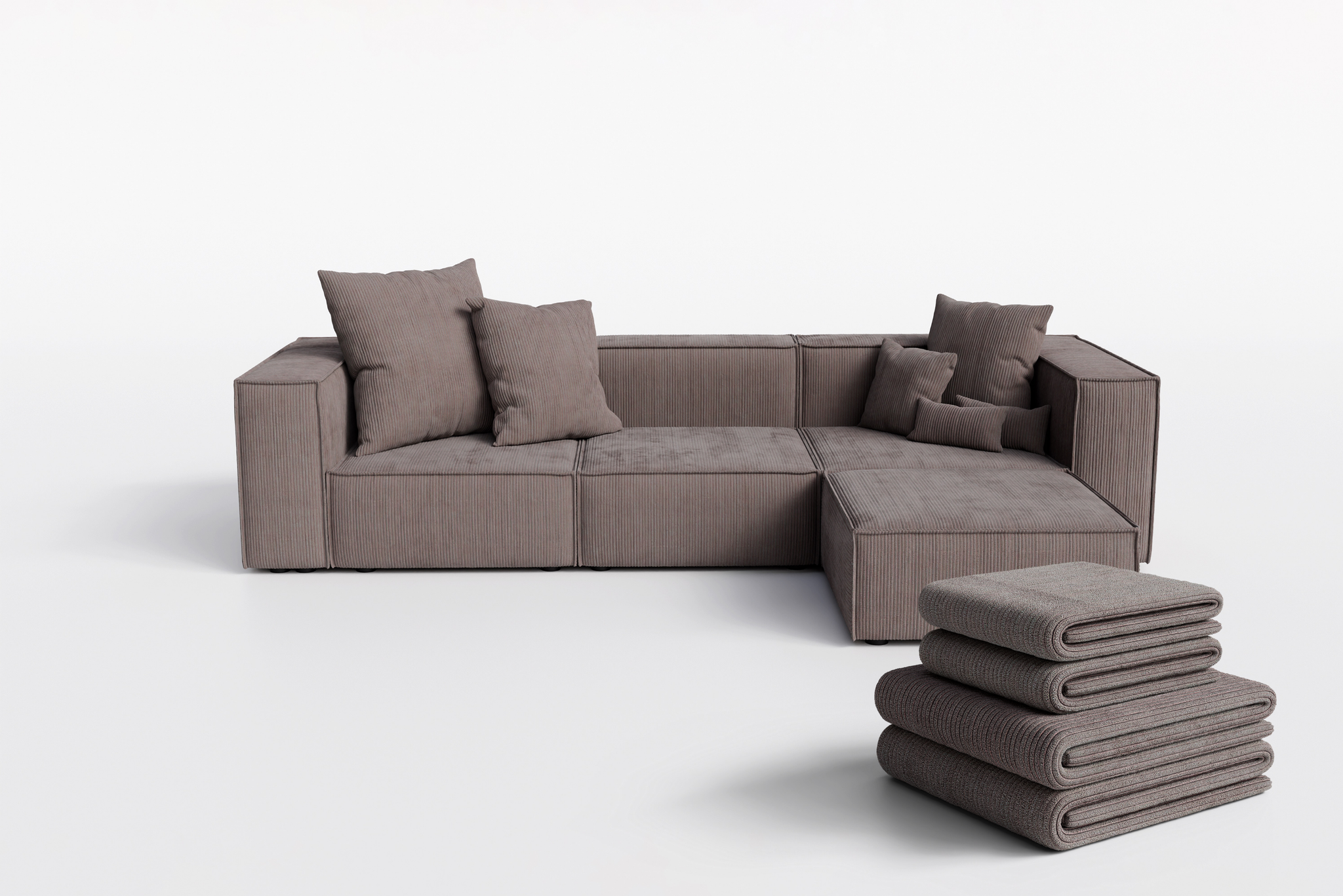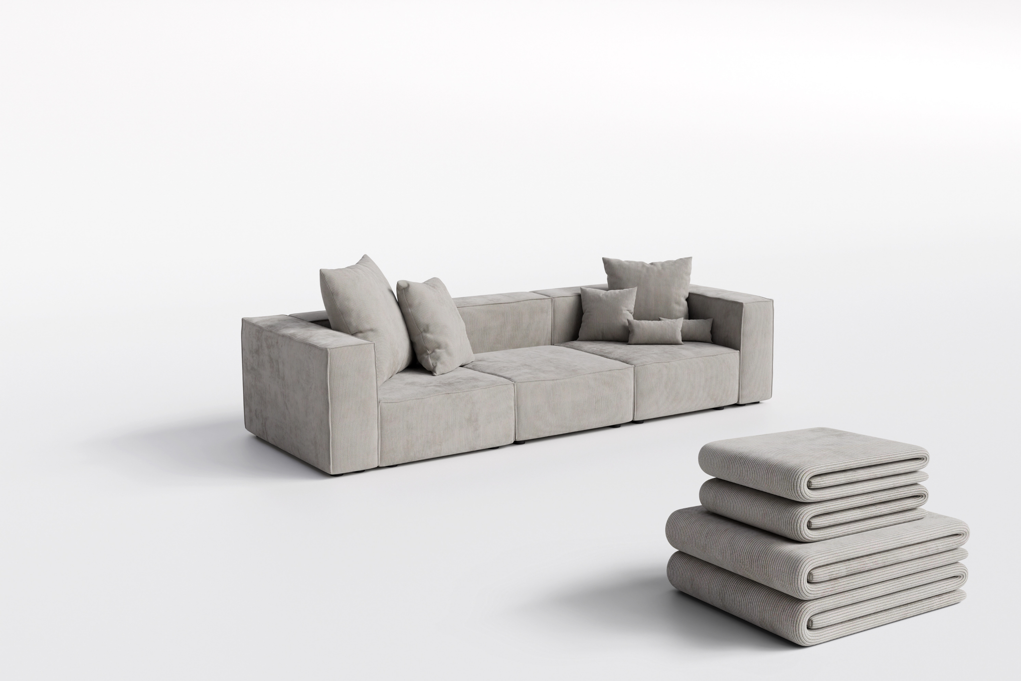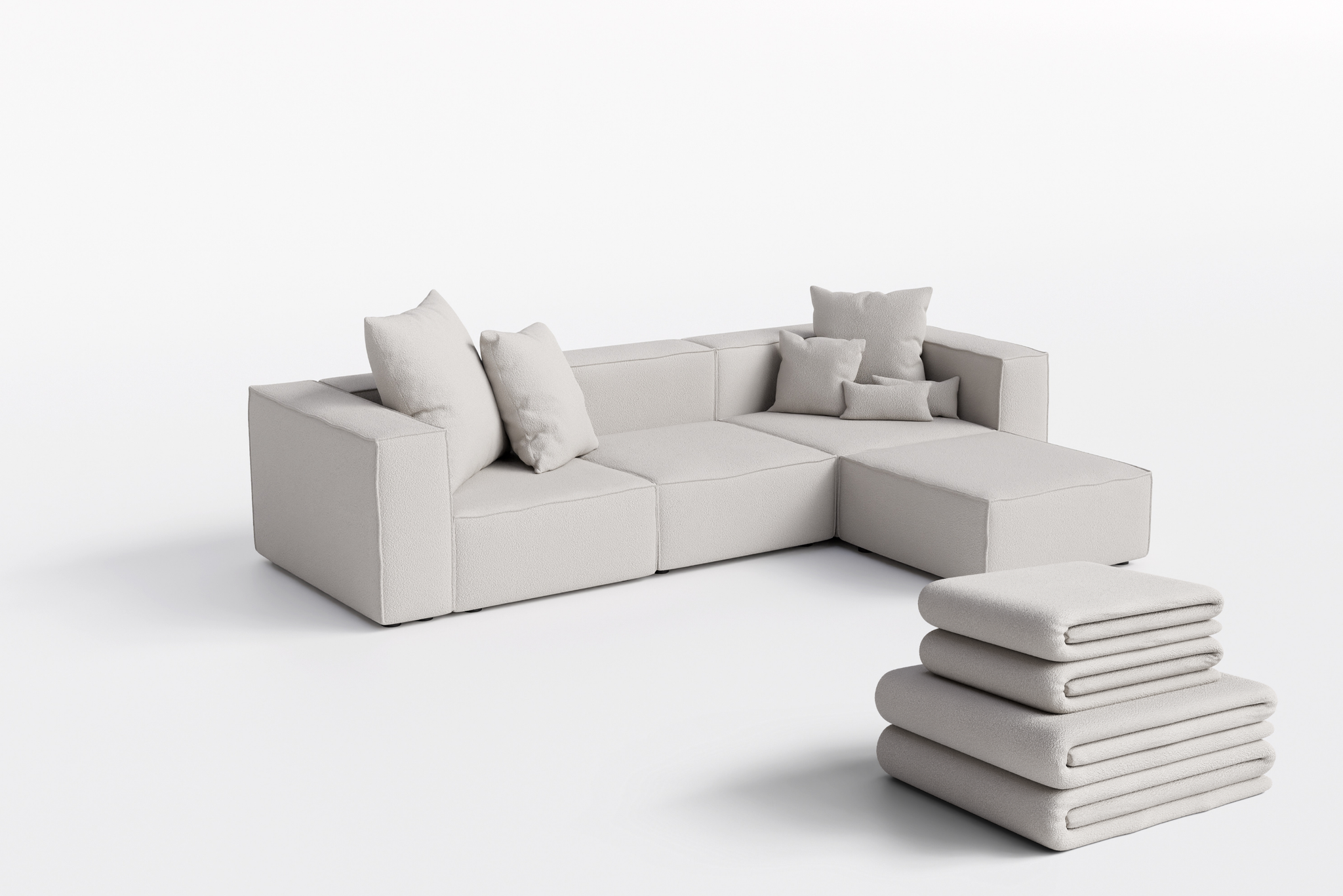 - Das gewählte Sofa als einzelne Module – bereits mit dem gewählten Stoff bezogen