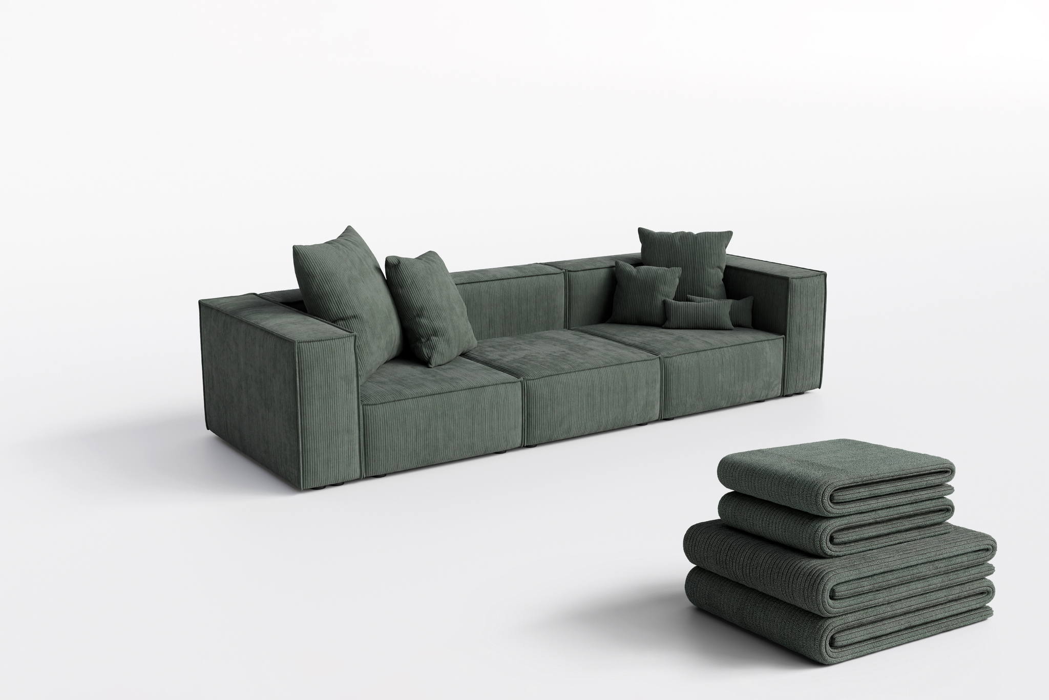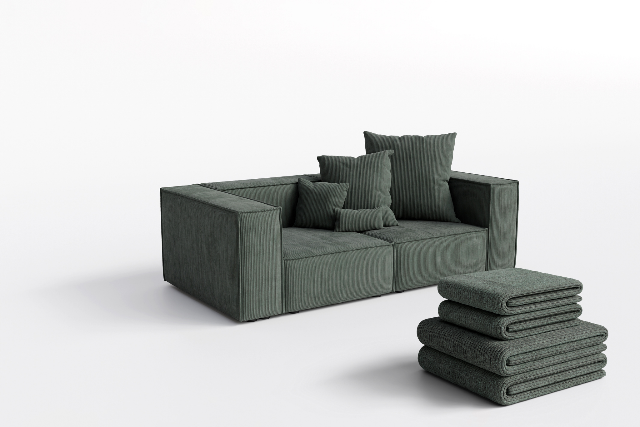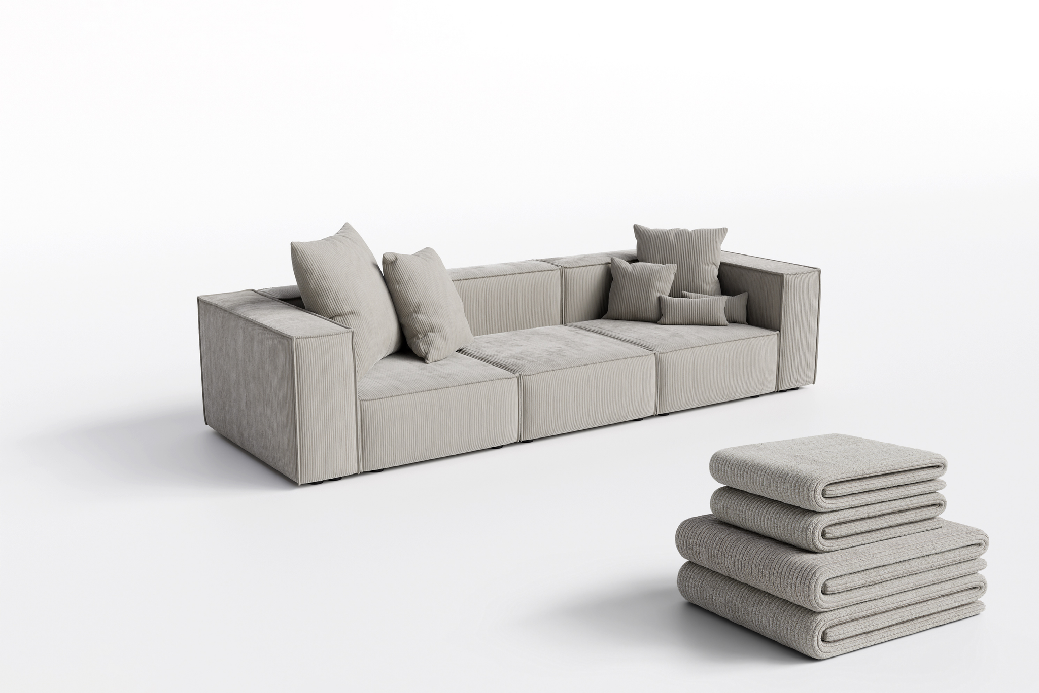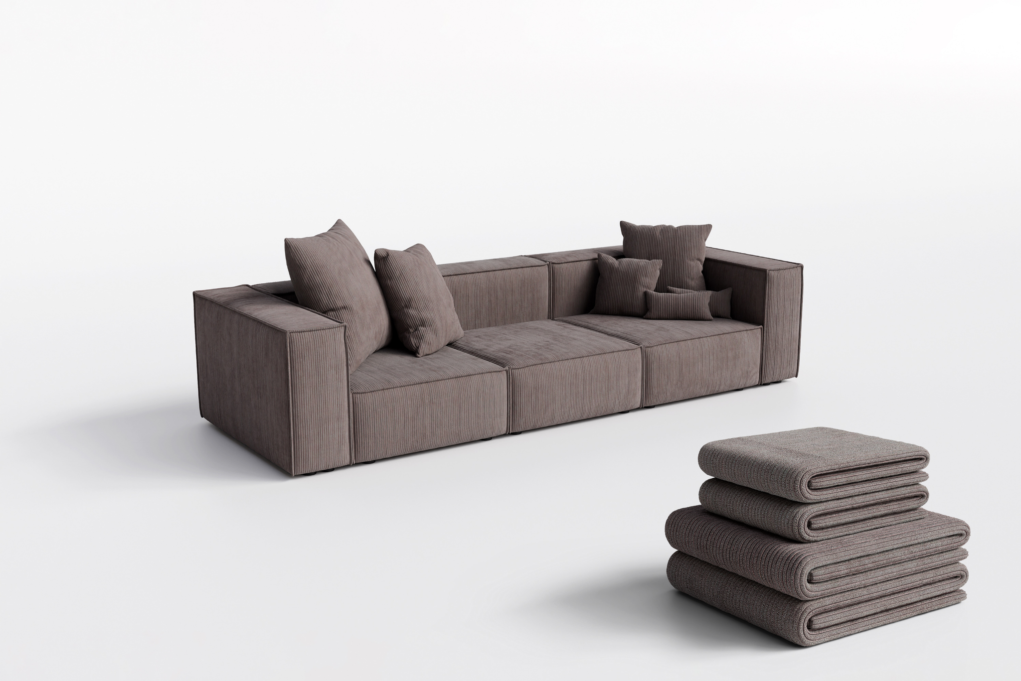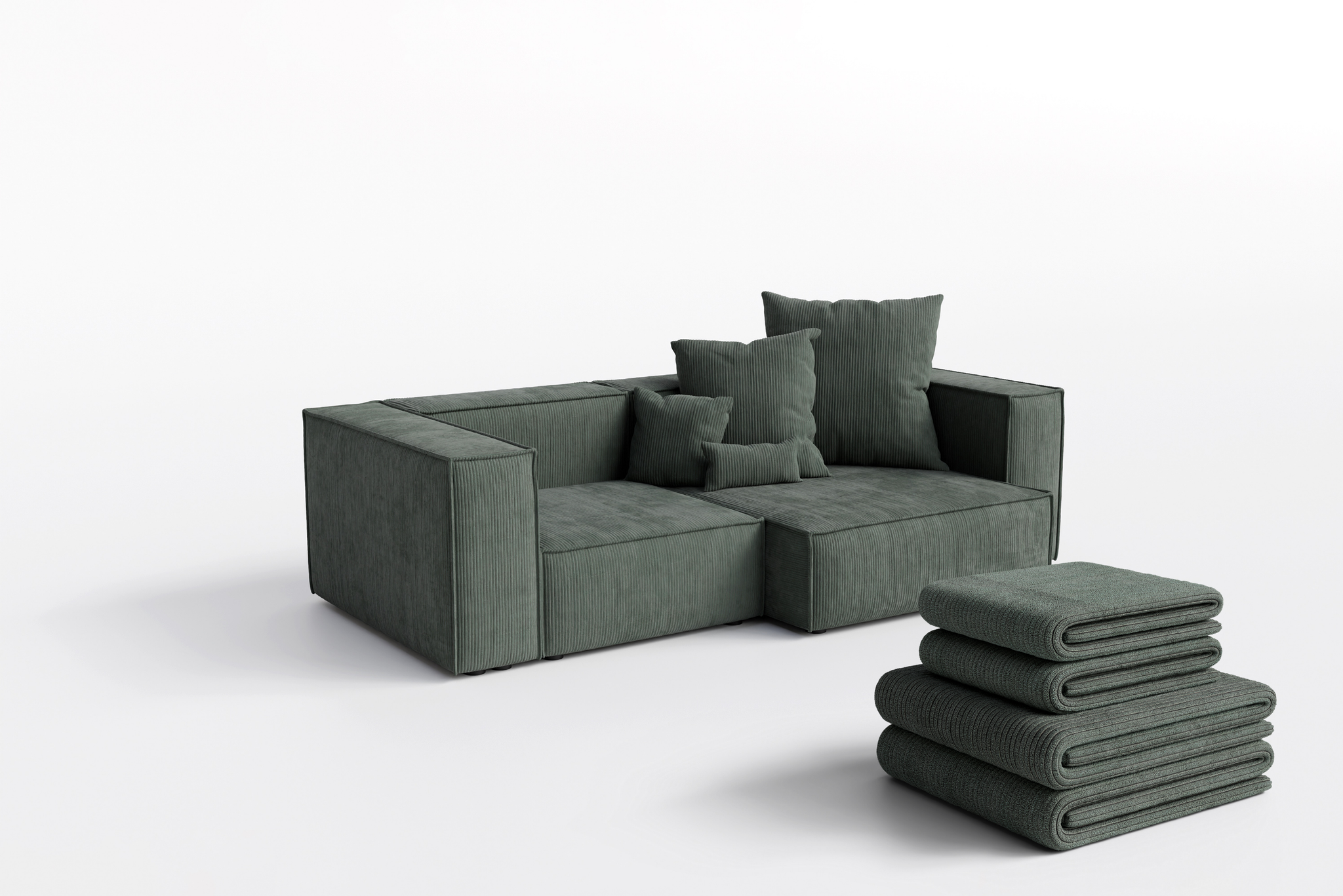 - Das gewählte Sofa als einzelne Module – bereits mit dem gewählten Stoff bezogen
