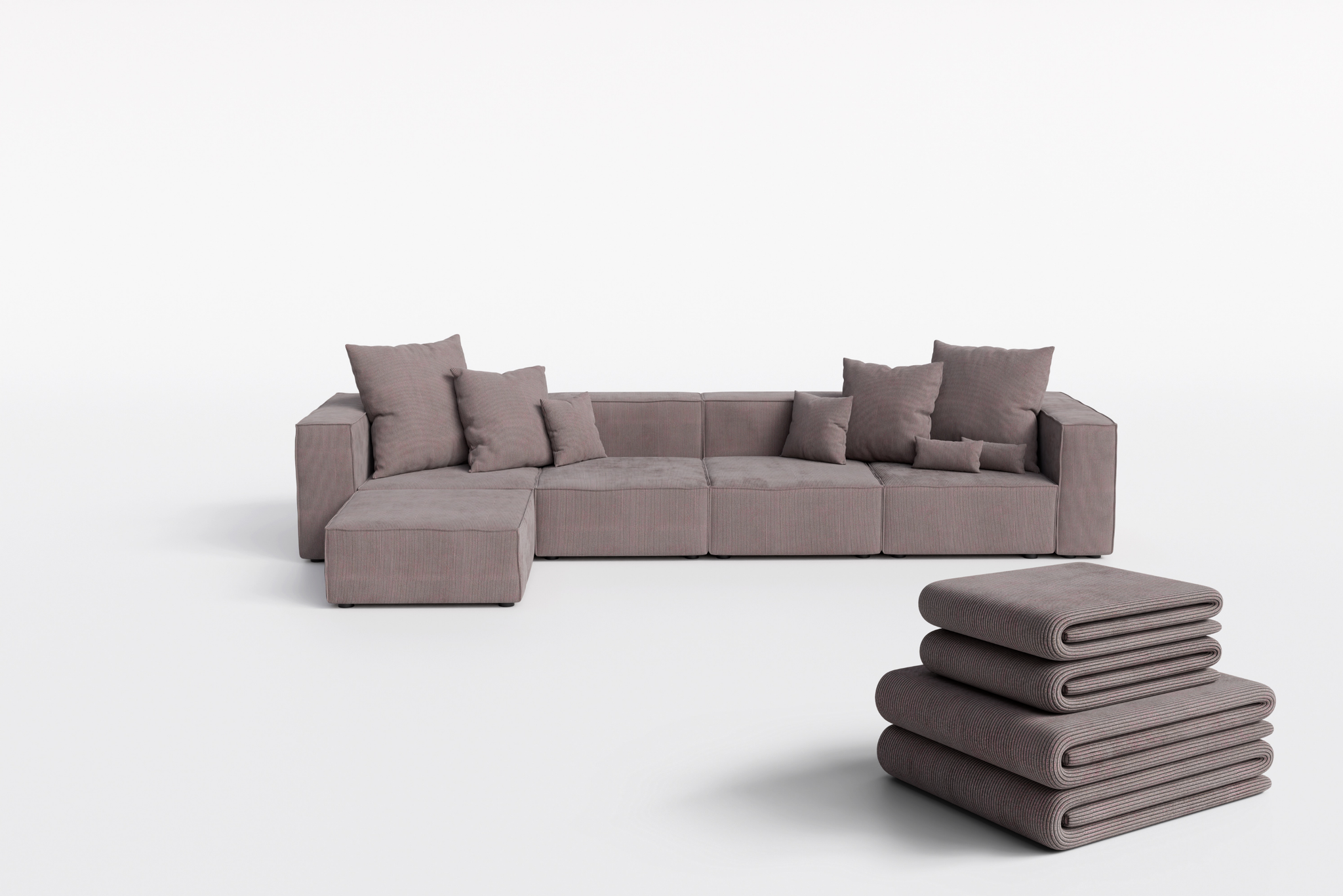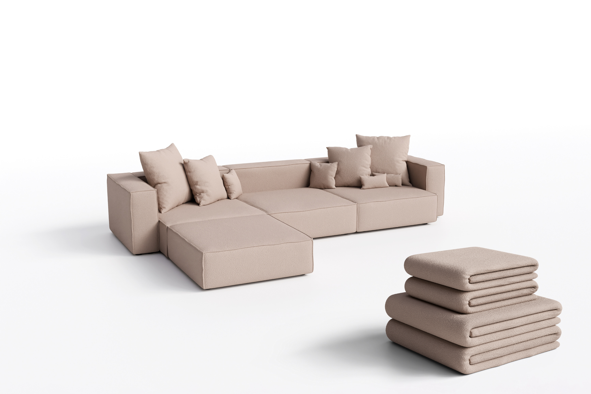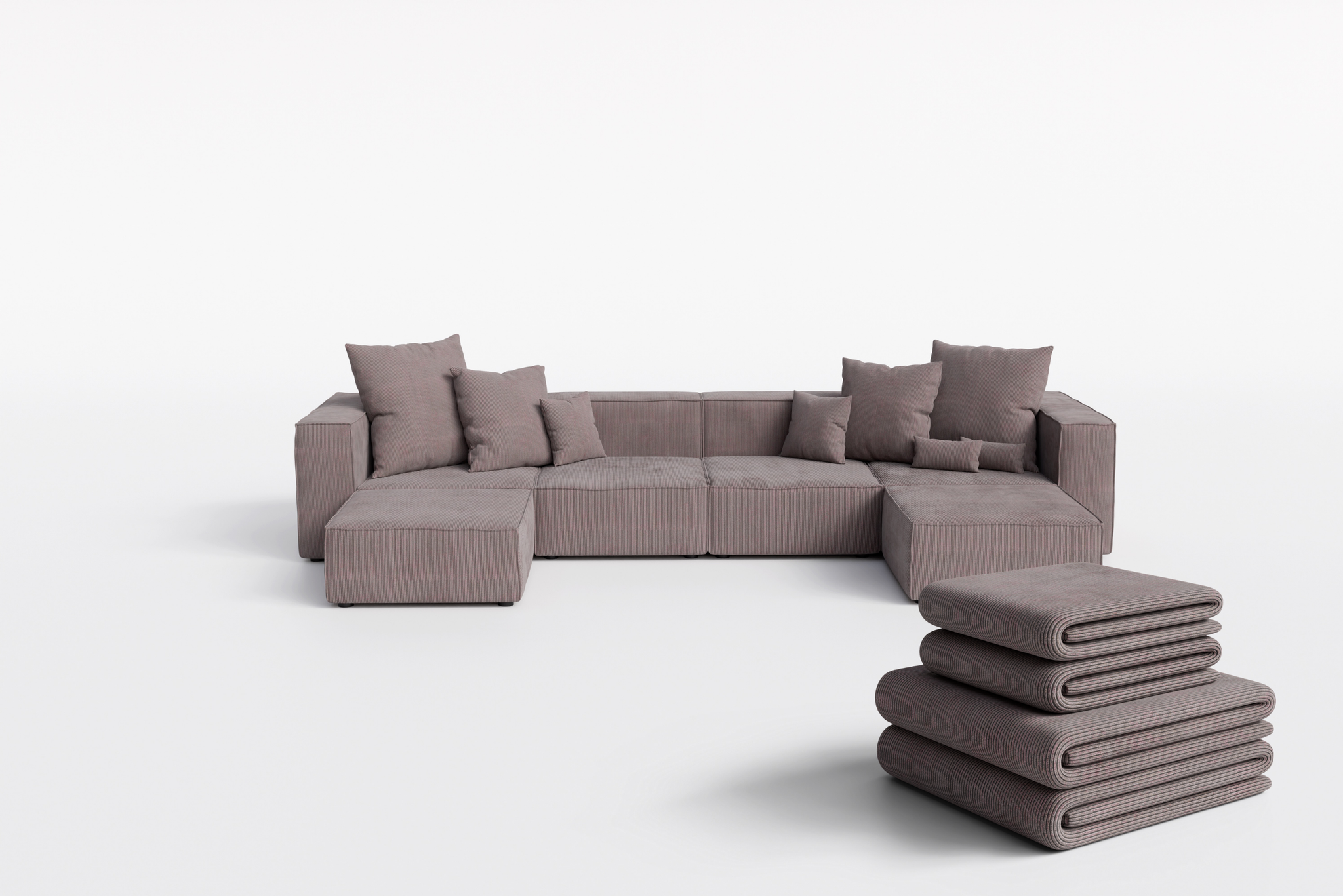 Die Module lassen sich auf vielfältige Weise miteinander kombinieren und bleiben dennoch fest an ihrem Platz. So entsteht ein flexibles System, das sich bei Bedarf jederzeit umstellen oder erweitern lässt, aber in der Nutzung so stabil wirkt wie ein festes Sofa.